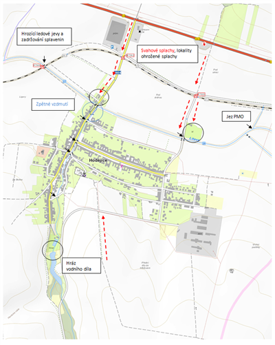 Z hlediska svahových splachů je nutné monitorovat situaci v blízkosti splachových tras (viz mapa) a zabezpečovat průtočnost v propustcích (aby nedošlo k rozlivu na komunikaci). Splachy mohou ohrožovat následující objekty: č. p. 264, 267, 268, 271, 281, 282, 283 a 286.